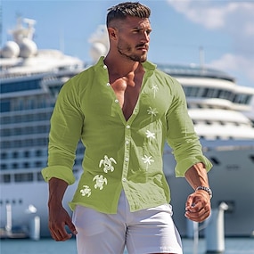 Herren Tropisch Palme Schildkröte Sommer Hawaiihemd Alohahemd Bedruckte Hemden Langarm Hemd Umlegekragen Hawaiianisch Resort Urlaub Ausgehen Strand Schwarz Weiß Grün S M L
