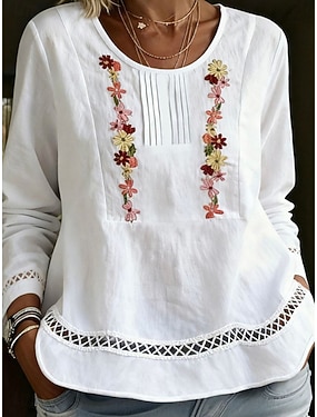 Damen Bluse Elegante Oberteile Kunstbaumwollleinen Gerafft Patchwork Bestickt Blumen Einfach Elegant Vintage Damen Langarm Rundhalsausschnitt Normale Oberteile Täglich Arbeit Ferien Blau Weiß Rosa