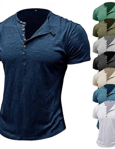 100 % Baumwolle, Herren-T-Shirt, Henley-Shirt, Kurzarmhemd, T-Shirt, Top, schlicht, Vintage, Designer, Basic, Henley zum Zuknöpfen, Urlaub, Straße, lässig, Alltag, Frühling, Sommer, schwarz, weiß, hellgrün, Henley-T-Shirt