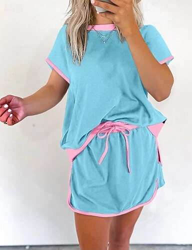 Damen T Shirt Rock-Sets Shorts-Sets Kurzarm Rundhalsausschnitt Farbblock Patchwork Mode Basic Urlaub Alltagstauglich Schwarz Rosa Himmelblau Sommer Normale Passform