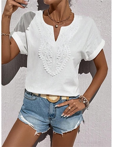 Damen Sommeroberteile Bluse Spitzentops Gerafft Spitze Patchwork Einfarbig Einfach Elegant Vintage Damen Kurzarm Fledermaus Ärmel V Ausschnitt Normale Oberteile Täglich Arbeit Ferien Weiß Sommer