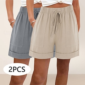 2er-Pack Damen-Shorts aus Baumwoll-Leinen, Sommer-Shorts, Strand-Shorts, Urlaubs-Shorts, Basic-Shorts mit hohem Bund, schlichter Tasche, elastischem Bund, bequem, weich, komfortabel, nicht elastisch, für Alltag, Outdoor, Streetstyle, Khaki + Schwarz