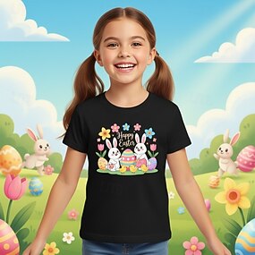 Oster-T-Shirt für Mädchen aus 100 % Baumwolle, blau, schwarz, weiß, mit Hasenmotiv, Rundhalsausschnitt, Kurzarm, für Urlaub und Sport &Outdoor-Bekleidung für den Alltag, aktive Mode, lässige Prints,
