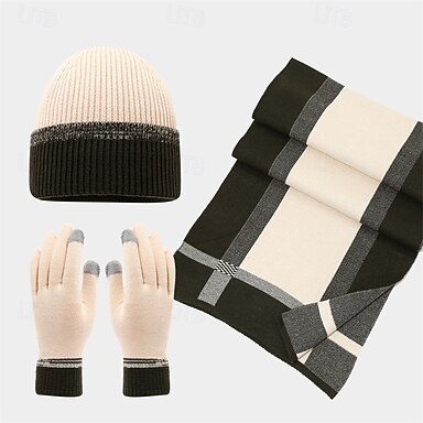 Herren Beanie Mütze Wintermützen Beanies Set aus Mütze und Handschuhen Winter Beanie Kaki Hellgrau Acrylfasern 3 Teile Gestrickt Gemütlich Alltagskleidung Ausgehen Farbblock Warm