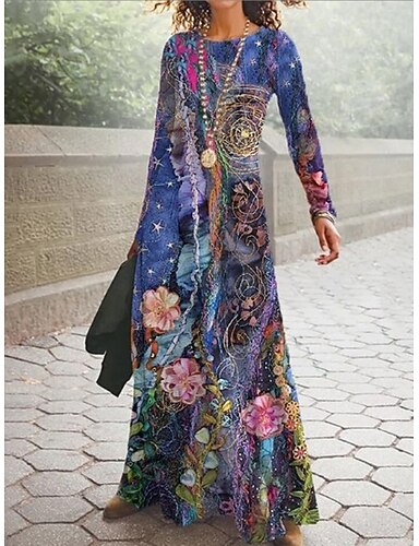 Damen Maxi Kleid Vintage Bohemian A-Linie Kleid Rundhalsausschnitt Langarm Lässig Kleid Winterkleid Swing Kleid Outdoor Täglicher Date Regulärer Schnitt Floral Blau Herbst Winter