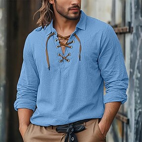 Herren Hemd Leinenhemd Wikinger-Stil Sommerhemd Strandhemd Einfarbig Urlaub Lässig Weiß Blau Orange Grün Langarm Umlegekragen Sommer Frühling Bekleidung Schnürung