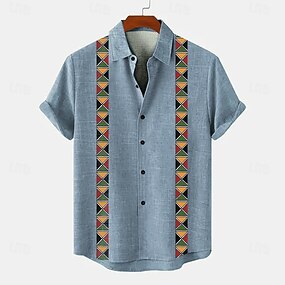 Herren Leinenhemd Sommerhemd Strandbekleidung Knopfhemd Stammes Urlaub Lässig Blau Grün Khaki Kurzarm Umlegekragen Sommer Frühling Bekleidung