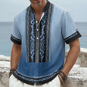 Herren Ethnisch Hemd Leinenhemd Henley Hemd Kurzarm Lässig Tribal Täglich Urlaub Sommer Frühling Mandarinkragen Druck Blau Grün Khaki
