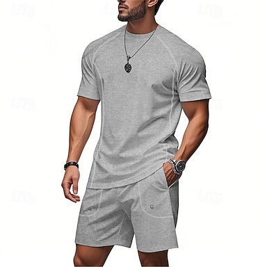 Herren Trainingsanzug T-Shirt und Shorts Outfit-Set Rundhalsausschnitt Outdoor Täglich Sport Tasche Kordelzug Einfach Schwarz Braun Hell Gray Polyester Sportkleidung Streetwear Leicht Sommer