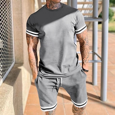 Herren Trainingsset Trainingsanzug T-Shirt und Shorts einstellen Outfit-Set Rundhalsausschnitt Outdoor Täglich Sport Tasche Kordelzug 2 teilig Farbblock Schwarz Rote Hell Gray Polyester Sportkleidung