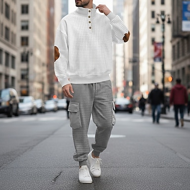 Herren Sweatshirt Trainingsanzug Waffle Kapuzensweatshirt Outfit-Set Stehkragen Outdoor Täglich Sport Jacquard Kordelzug Knopf hoch Farbblock Weinrot Weiß Hellgrün Sportkleidung Mode Streetwear