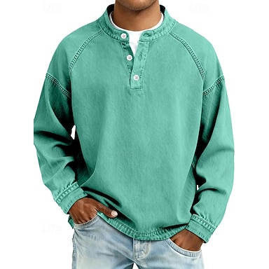 Herren T Shirt Henley Hemd Hemd aus 100 % Baumwolle in Säurewaschung T-Shirt Langarm Einfach Vintage Streetwear Lässig Gewaschen Raglanärmel Stehkragen Henley Lässig Heim Straße Frühling Herbst