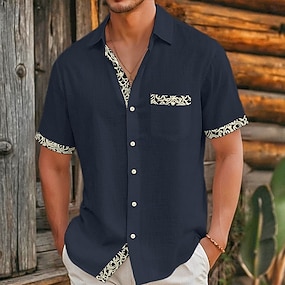 Herren Leinenhemd Sommerhemd Strandbekleidung Knopfhemd Stammes Urlaub Lässig Braun Grün Khaki Kurzarm Umlegekragen Sommer Frühling Bekleidung