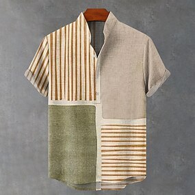 Herren Leinenhemd Popover-Hemd Henley Hemd Retro-Shirts Vintage-Shirt Ethno-Hemd Gestreift Urlaub Lässig Khaki Kurzarm Mandarinkragen Sommer Frühling Bekleidung