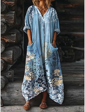 Damen Langes Kleid Maxikleid Boho-Kleid Vintage-Kleid Freizeitkleid Vintage Täglich Outdoor Urlaub Normale Passform Blumen Ethnisch Langarm V Ausschnitt Blau Frühling Herbst