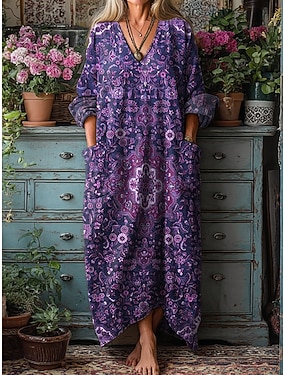 Damen Maxikleid Vintage-Kleid Freizeitkleid Vintage Täglich Outdoor Urlaub Normale Passform Batik Langarm V Ausschnitt Purpur Frühling Herbst
