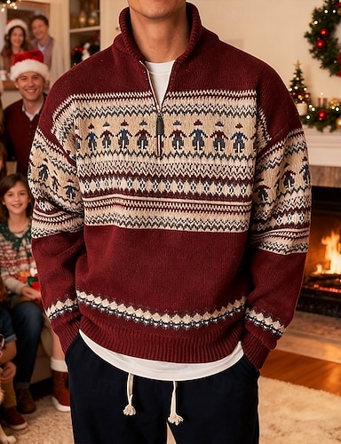 Herren Weihnachtspullover Pullover Fair Isle Sweater Pullover mit Viertelreißverschluss Strickpullover Gerippt Stricken Normale Oberteile Gestrickt Jacquard Viertelreißverschluss Vintage Mode