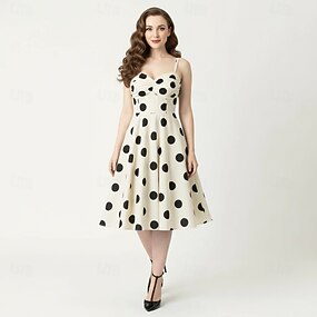Rockabilly Midlänge A-Linien-Kleid Spaghettiträger Tupfen Tailliert und ausgestellt Kostüm Damen Karneval Valentinstag Lässig Heimkehr Retro-Mottoparty Erwachsene Kleid Sommer Frühling