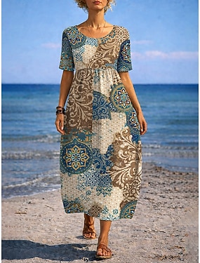 Damen Maxikleid A Linie Kleid Sommerkleid Urlaub Lässig Täglich Ferien Lässiger Schnitt Grafik Paisley-Muster Stammes Halbarm Rundhalsausschnitt Kamel Purpur Grün Sommer