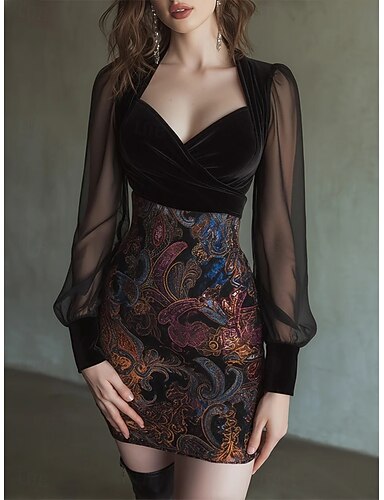Damen Minikleid Freizeitkleid Blumenkleid Elegant Mode Modern Outdoor Urlaub Party Normale Passform Paisley-Muster Langarm V Ausschnitt Schwarz Frühling Herbst