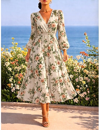 Damen Midikleid Faltenkleid Figurbetontes Kleid Geburtstag Lässig Formell Büro Date Normale Passform Blumen Grafik Langarm V Ausschnitt Beige Sommer Frühling
