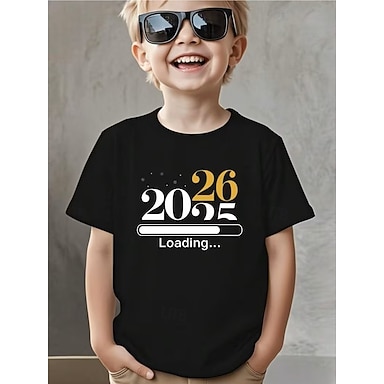 Baumwoll-T-Shirt für Jungen, ideal für die Silvesterparty 2026, schwarz-weiß, mit Grafikdruck und Zahlenmotiv, Rundhalsausschnitt, Kurzarm, für Outdoor-Aktivitäten, Alltag, Streetwear, Designer-Look,