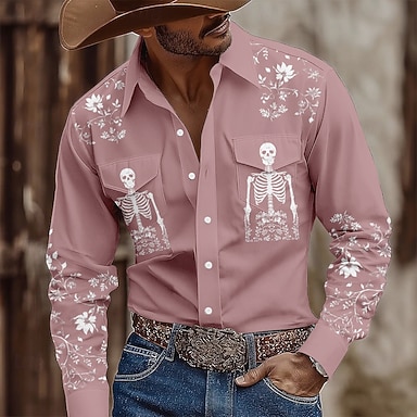 Herren Schädel Blumendruck Blumen Hemd Westernhemd Cowboy-Shirt Langarm Vintage-Retro Outdoor Lässig Arbeitskleidung Frühling Herbst Umlegekragen Zwei Fronttaschen Leinenähnliches Hemd Hemden mit
