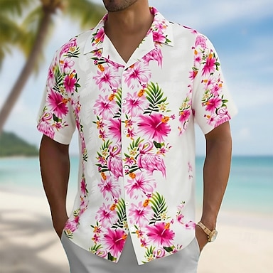 Herren Flamingo Blumendruck Blumen Hemd Kuba-Kragen-Hemd Sommer Hawaiihemd Kurzarm Hawaiianisch Urlaub Ferien Strandbekleidung Sommer Frühling Hemd mit Camp-Kragen 3D-Druck Rosa Orange