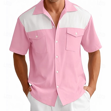 Herren Farbblockierung Hemd Knopfhemd Lässiges Hemd Kurzarm Modisch lässig Urlaub Alltagstauglich Sommer Frühling Umlegekragen 3D-Druck Zwei Fronttaschen Leinenähnliches Hemd Blau Rosa Purpur Grün