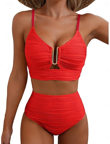 Damen Badeanzug Bikini Zweiteilig Hohe Taillenlinie Bademode Gerafft Rückenfrei Urlaub Strandbekleidung Einfach V Ausschnitt Ärmellos Badeanzüge