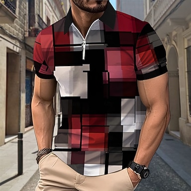 Herren Karomuster Poloshirts Reißverschluss-Polo Kurzarm Polo-Shirts Kragen Lässig Urlaub Formell Alltagskleidung 3D-Druck Sommer Frühling Blau Schwarz Gelb
