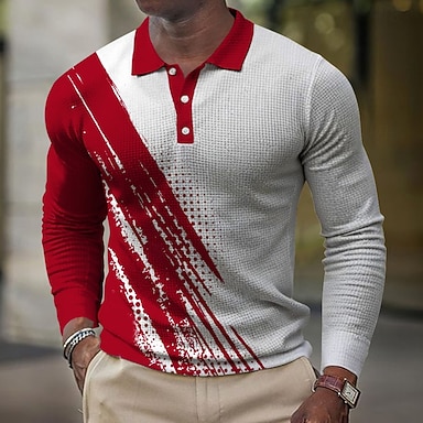 Herren Farbblock Geometrisch Waffel-Poloshirts Langarm Polo-Shirts Hemden mit Kragen Lässig Alltagskleidung Knöpfe Frühling Herbst Winter Blau Rote Grün