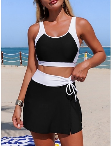 Damen Badeanzug Bikini Zweiteilig Rock Bademode Bauchkontrolle Hohe Taille Schlank Rückenfrei Urlaub Strandbekleidung Einfarbig Rundausschnitt Ärmellos Badeanzüge