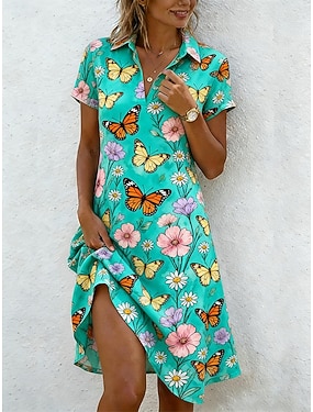 Damen Knielanges Kleid Boho-Kleid Freizeitkleid Druckkleid Mode Klassisch Modern Outdoor Urlaub Ausgehen Normale Passform Blumen Schmetterling Kurzarm Hemdkragen Blau Sommer Frühling