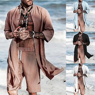 Herren Sommerhemd Freizeithemd Strandhemd Einfach Urlaub Straße Blau Kaffee Langarm Stehkragen Sommer Bekleidung Button-Down