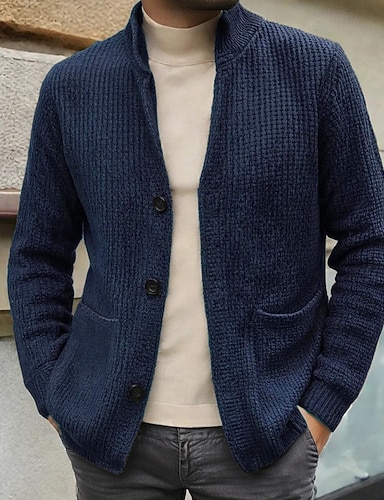 Herren Strickjacke Kurzer Pullover Strickpullover Gerippt Stricken Normale Oberteile Knopf hoch Tasche Einfach Stehkragen Mode Klassisch Urlaub Alltagskleidung Bekleidung Herbst Winter Schwarz