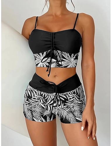 Damen Bikini 3-teilig Badeanzug Palm Shorts Bauchkontrolle Hohe Taille Slim Rückenfrei Urlaub Strandbekleidung Blumen Halterhals Ärmellose Bademode
