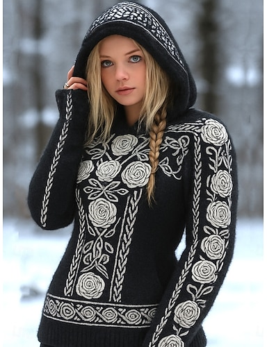 Damen-Vintage-Pullover im Wikinger-Stil, ideal für Urlaub, Alltag, Freizeit, mit floralem Kapuzenmuster, langen Ärmeln und normaler Passform, Strick, schwarz, für Frühling und Herbst