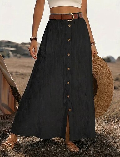 Damen Rock aus Leinenimitat Mode Küsten-Oma-Stil Lässig Sommer Maxi Mittlere Hüfthöhe Röcke Einfarbig Unelastisch Täglich Strand Schwarz Weiß Marinenblau Orange Sommer Polyester