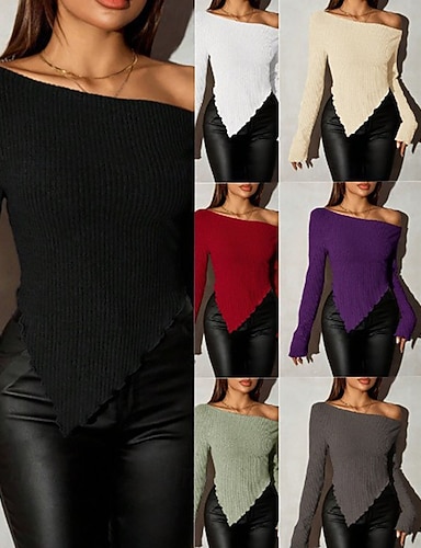 Damen Pullover Streetwear Sexy Lässig Einfarbig Schulterfrei Gestrickt Asymmetrischer Saum Langarm Normale Oberteile Stricken Täglich Ferien Ausgehen Weinrot Schwarz Herbst Winter