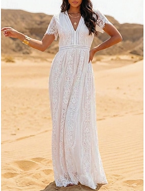 Damen Maxikleid Boho-Kleid Spitzenkleid Weißes Kleid Sommerkleid Elegant Mode Strand Urlaub Ferien Normale Passform Einfach Kurzarm V Ausschnitt Weiß Sommer Frühling