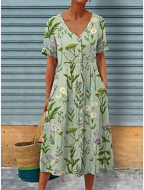 Damen Midikleid A Linie Kleid Urlaub Lässig Boho Normale Passform Blumen Grafik Kurzarm V Ausschnitt Blau Orange Grün Beige Sommer Frühling