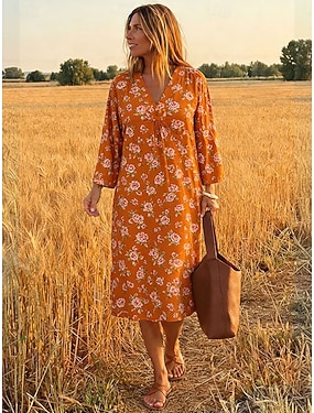 Damen Midikleid Sommerkleid A Linie Kleid Urlaub Vintage Lässig Strand Party Normale Passform Blumen Grafik Langarm V Ausschnitt Gelb Rosa Orange Khaki Sommer Frühling