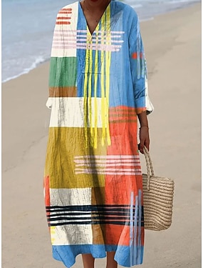 Damen Maxi langes Kleid A-Linie Kleid Urlaub Lässig Strand Reguläre Passform Grafisch Geometrisch Langarm V-Ausschnitt Pink Blau Lila Grün Sommer Frühling Herbst