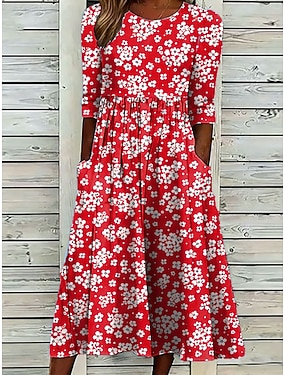 Damen Midikleid Sommerkleid Urlaub Lässig Boho Strand Ferien Lässiger Schnitt Blumen Grafik Dreiviertelarm Rundhalsausschnitt Blau Weiß Rosa Sommer Frühling