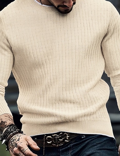 Herren Pullover Strickpullover Gerippt Stricken Normale Oberteile Gestrickt Farbblock Rundhalsausschnitt Mode Basic Urlaub Alltagskleidung Bekleidung Winter Khaki Beige S M L
