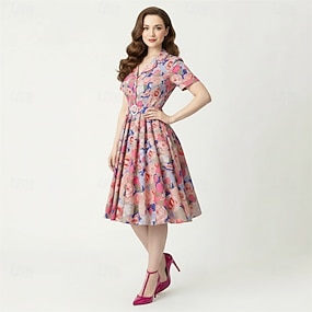 Rockabilly Midlänge A-Linien-Kleid Kurze Ärmel Tailliert und ausgestellt Kostüm Damen Karneval Valentinstag Lässig Heimkehr Retro-Mottoparty Erwachsene Kleid Frühling