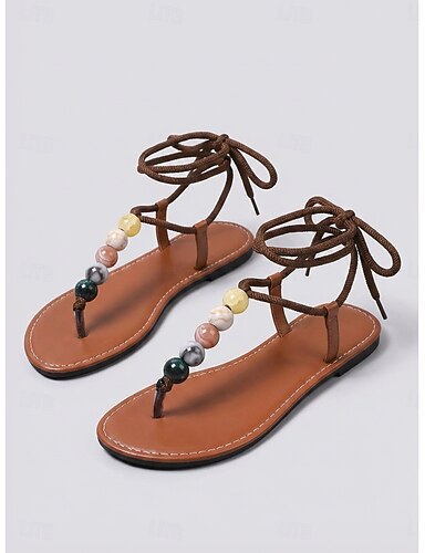 Schwarze Gladiator-Sandalen für Damen mit Schnürung – Boho-Sandalen mit Riemchen und bunten Perlen &Fußkettchen für Strandurlaube und Inselausflüge &Sommerfestival-Outfits
