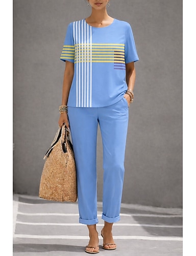 Damen Hosen-Sets Halbarm Rundhals Grafik Geometrisch Elegant Urlaub Lässig Täglich Urlaub Blau Weiß Purpur Sommer Normale Passform