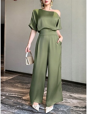 Damen Normal Overall Elegant Einfarbig Kurzarm Weites Bein Schulterfrei Patchwork Tasche Täglich Heim Normale Passform Wein Braun Grün Sommer